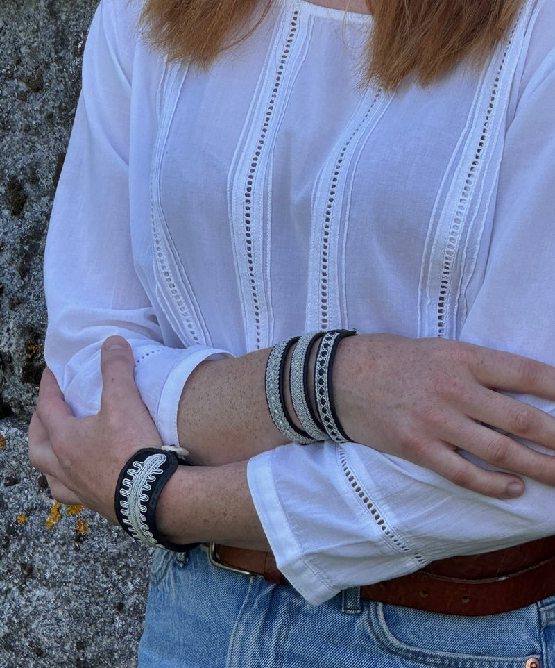The art of pewter thread embroidery from the Saami culture and the beautiful nordic nature are true inspirations for my designs and creativity. Incorporating contemporary elegance and simplicity, I strive to honor and share my dedication to this traditional handcraft from my homeland. Each piece is uniquely handmade by me in California. Please allow up to two weeks for delivery.